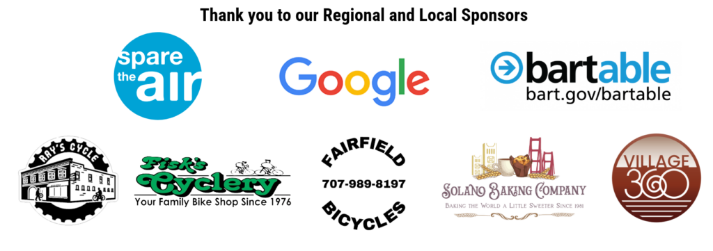 In addition to MTC (the transportation planning, financing, and coordinating agency for the nine-county San Francisco Bay Area), 511 (the region’s traveler information system), and Amazon, Bike to Wherever Days/Bike to Work Day 2026 receives regional support from Spare the Air, Google, and BARTable. Visit Bay Area Bike To Work for more information on all Bay Area Bike to Wherever Days events. Thank you to Solano County sponsors Fairfield Bicycles, Fisk’s Cyclery, Ray’s Cycle, Village 360, and Solano Baking Company.