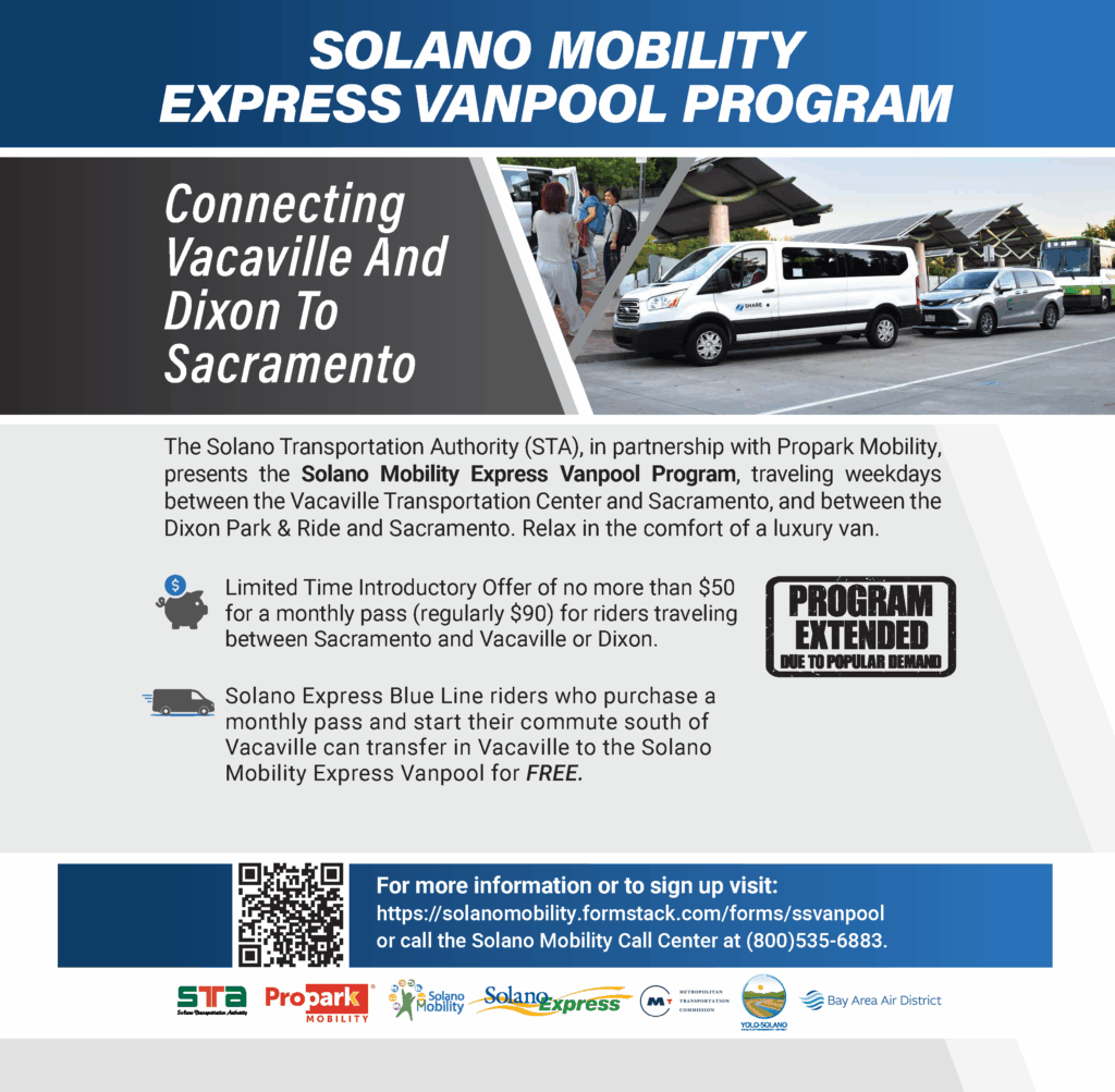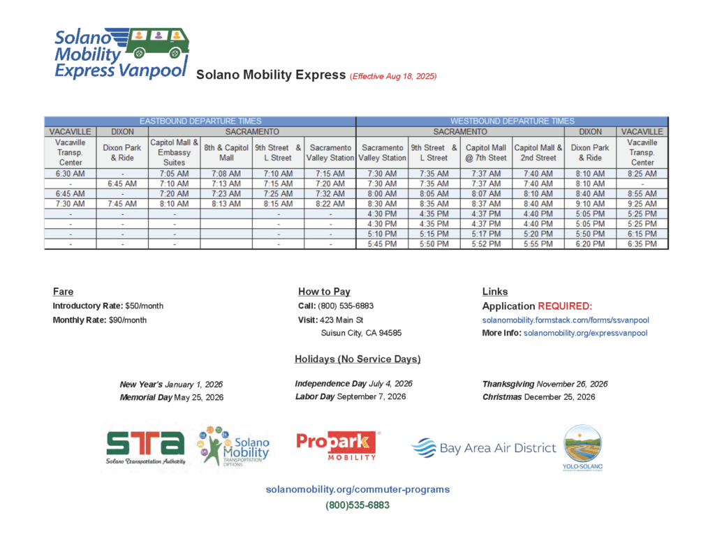 The Solano Mobility Express Vanpool travels weekdays between the Vacaville Transportation Center and Sacramento, and between the Dixon Park & Ride and Sacramento. Relax in the comfort of a luxury Van.