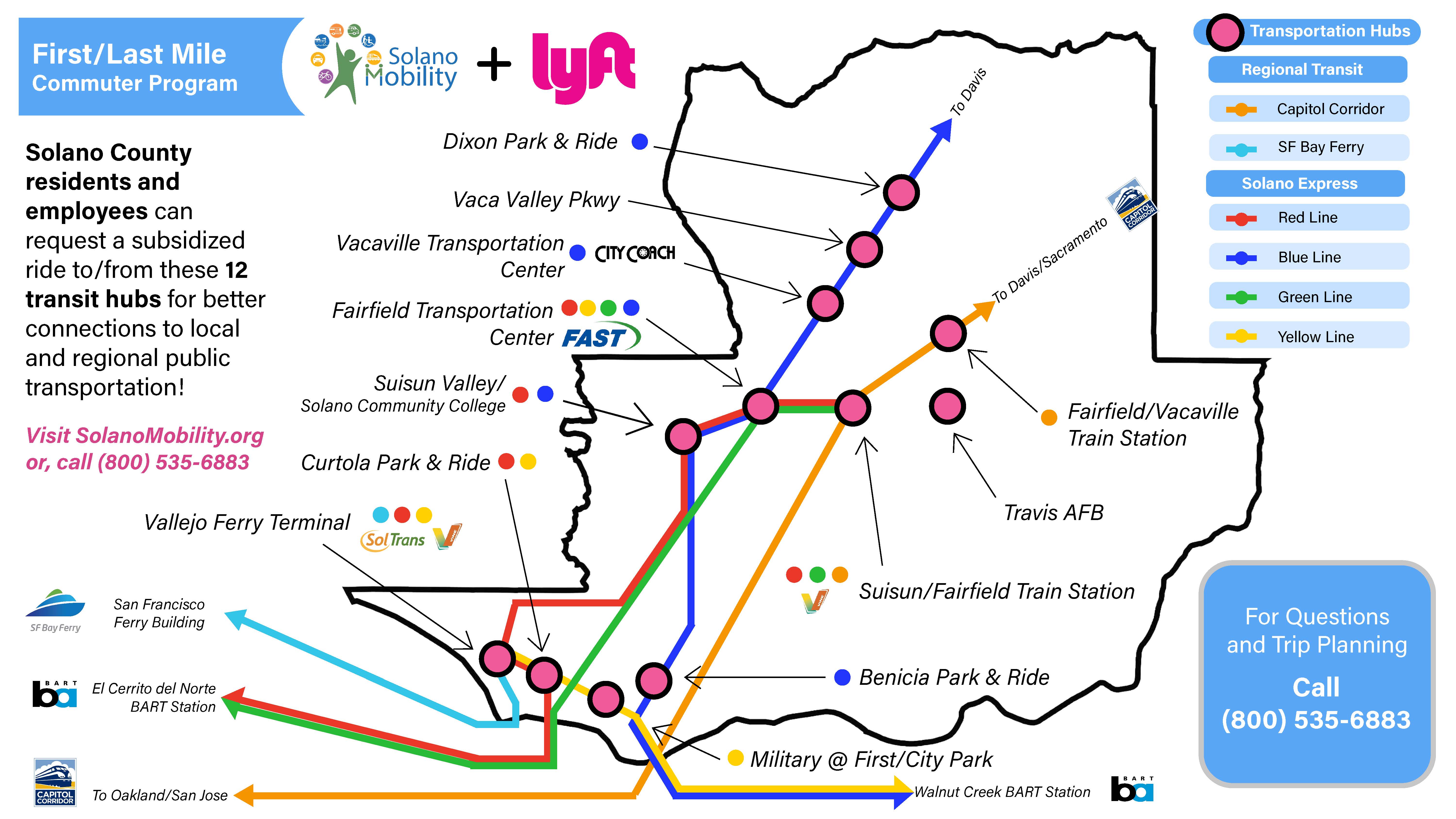 Solano Mobility and Lyft have partnered to provide 60% off Lyft rides (up to $20) (80% off Lyft rides low-income subsidy; for more information see below) to all Solano County Transportation Centers, the two Solano County train stations, and all Solano County SolanoExpress bus stops (12 transit locations total). All participants are eligible for 45 rides in one calendar month. Participants must live or work in Solano County and be over the age of 18. The program shall not be used for pickup or drop off outside of Solano County. Staff reserves the right to remove participants for misuse of the program.