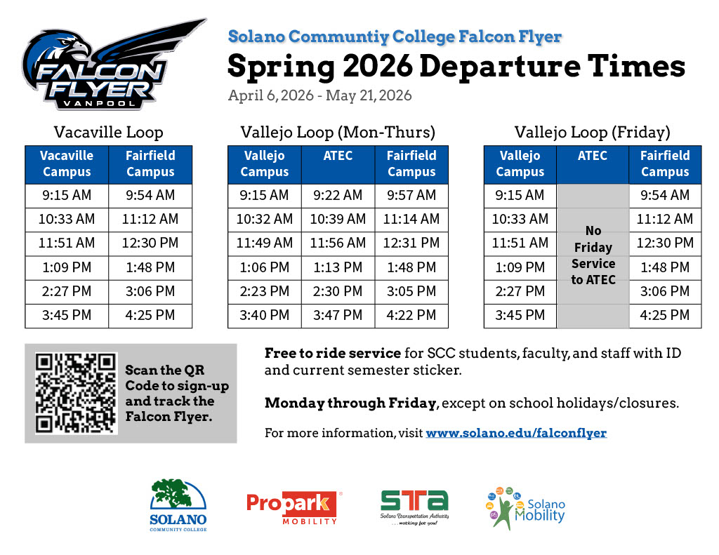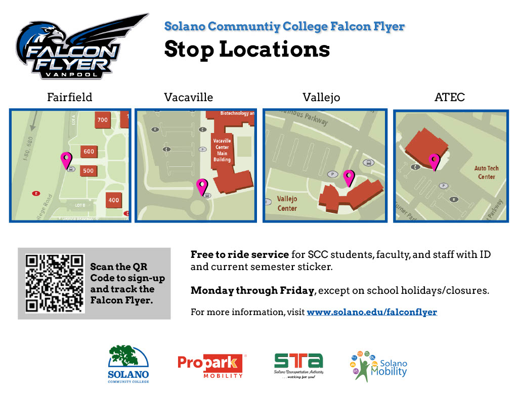 The Falcon Flyer is a free intercampus vanpool service for Solano Community College students traveling between the Fairfield, Vacaville, and Vallejo/ATEC campuses.