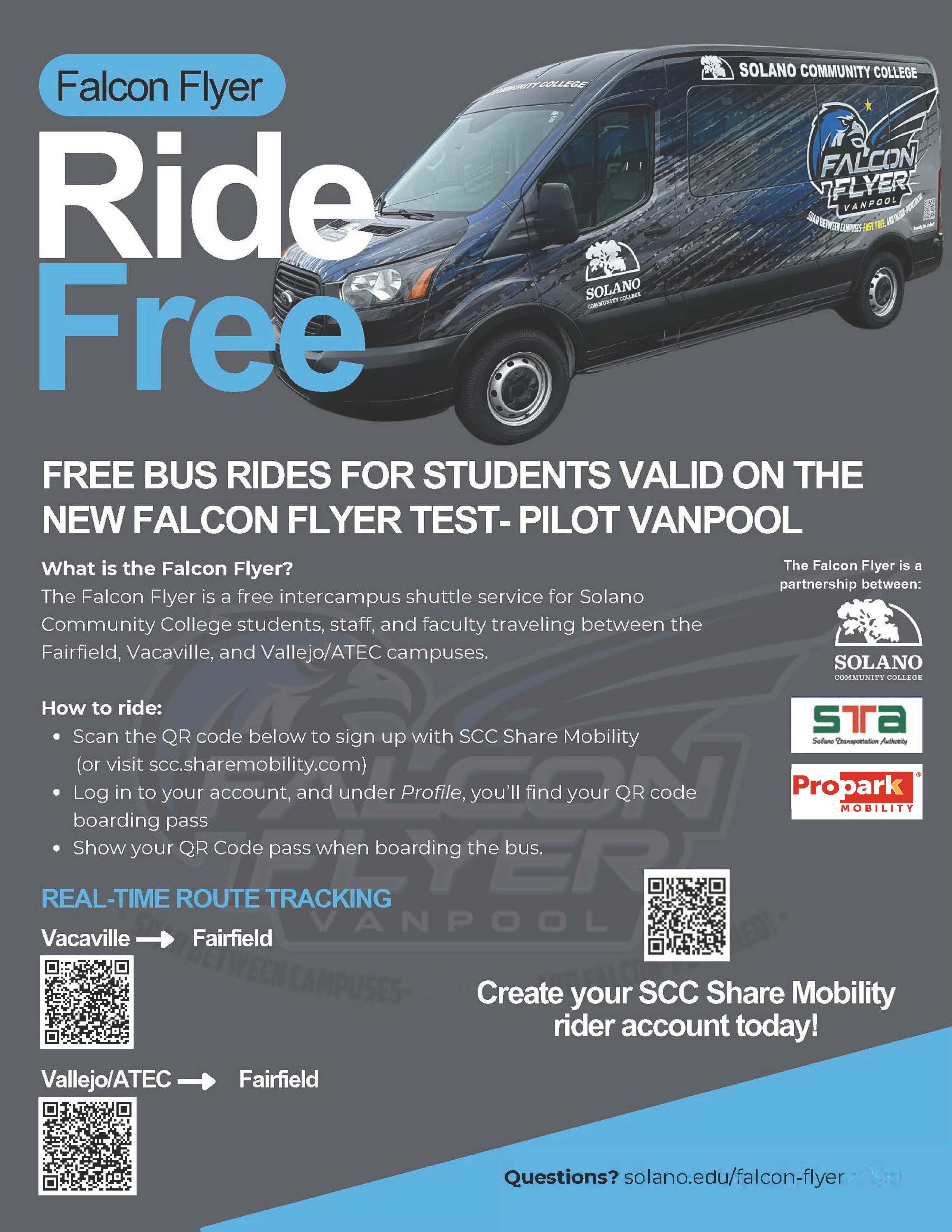 The Falcon Flyer is a free intercampus vanpool service for Solano Community College students traveling between the Fairfield, Vacaville, and Vallejo/ATEC campuses.