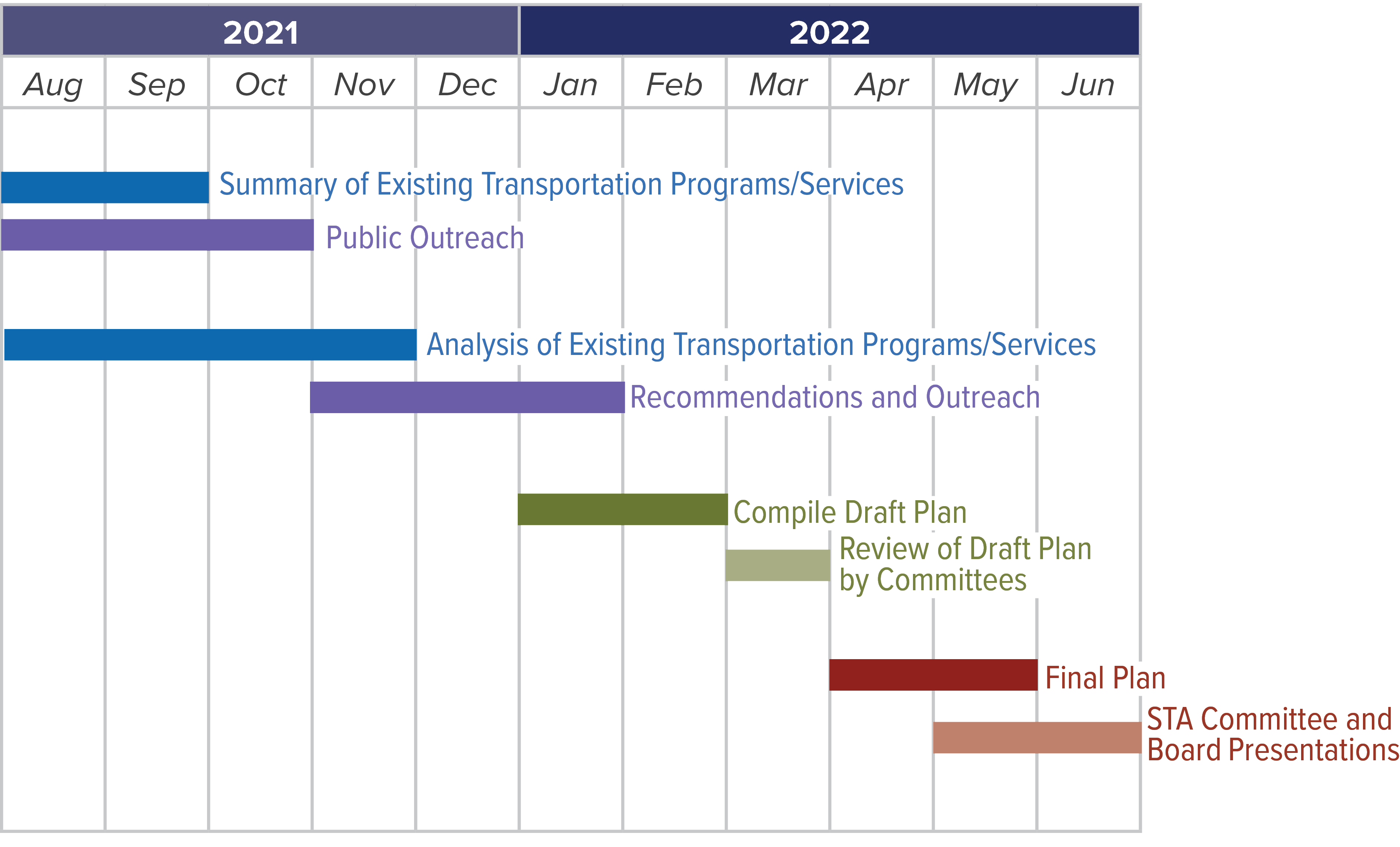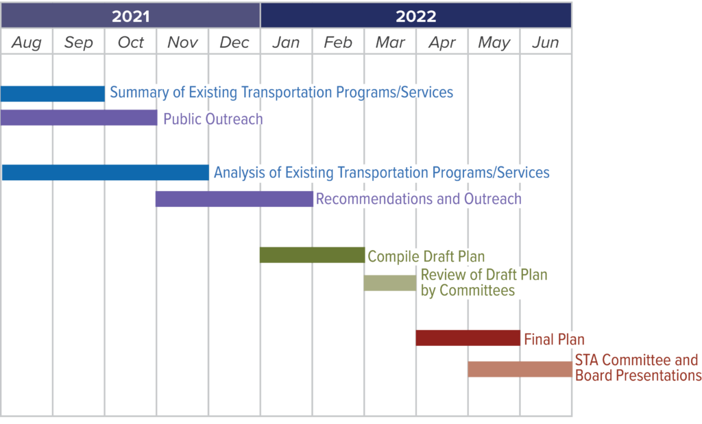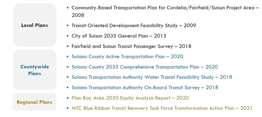 The project team is conducting a robust analysis of existing transportation services, local and countywide demographics, and regional plans to identify transportation trends, challenges, and opportunities. Along with your input, this information will allow us to propose changes that will strengthen the network of mobility alternatives in Suisun City.